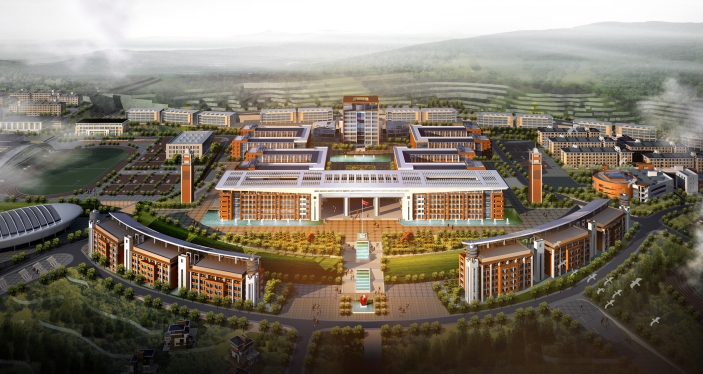 云南技師學(xué)院規(guī)劃總體形式特色鮮明,以觀音山山體為主體,因地制宜地布局,以中心教學(xué)組團(tuán)為核心,大致順等高線成環(huán)布置路網(wǎng),形成兩條優(yōu)美的弧線線條舒展于山體南北兩側(cè),將中心組團(tuán)區(qū)域含在其中,貫穿基地中心的南北主軸線,一統(tǒng)控制了整個校區(qū),強(qiáng)化了中正大氣的校園特色。東西宿舍組團(tuán)和原有校區(qū)均勻布滿了整個基地,勻稱且自然。